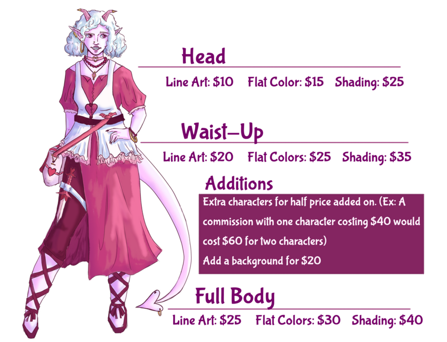 Extra characters can be added for half the price of the original commission added on. (Ex: $40 dollars for one fully rendered full body character, each additional character would be $20). Limit of five characters.Add a background for $20 dollarsHave a different idea you want me to do? No problem! I love doing stuff like comics and digital painting. We can figure out pricing if your idea doesn't really fit the standard price sheet..